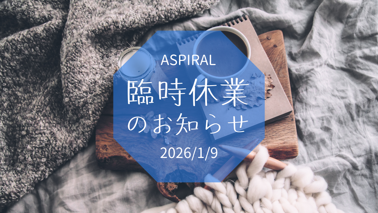 aspiral blog 《臨時休業のご案内》2026/1/9(金) aspiral 2026年1月6日 2026/1/9(金) は臨時休業させていただきます ご覧いただきまして、ありがとうございます。 誠に勝手ながら、2026/1/9(金)~12(日) 期間中は、発送・お問い合わせ業務をお休みさせていただきます。 ご不便をおかけいたしますが、どうぞよろしくお願いいたします。 ※定休日は、水・土日祝日となります。