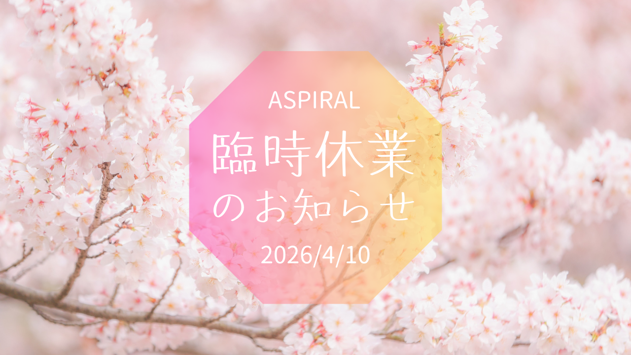 aspiral blog 《臨時休業のご案内》2026/4/10(金) aspiral 2026年4月3日 2026/4/10(金) は臨時休業させていただきます ご覧いただきまして、ありがとうございます。 誠に勝手ながら、2026/4/10(金) は、発送・お問い合わせ業務をお休みさせていただきます。 ご不便をおかけいたしますが、どうぞよろしくお願いいたします。 ※定休日は、水・土日祝日となります。